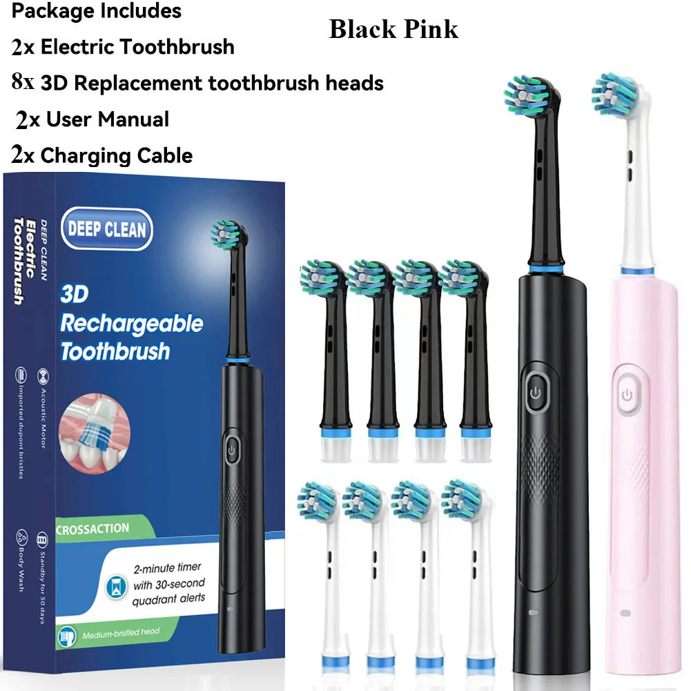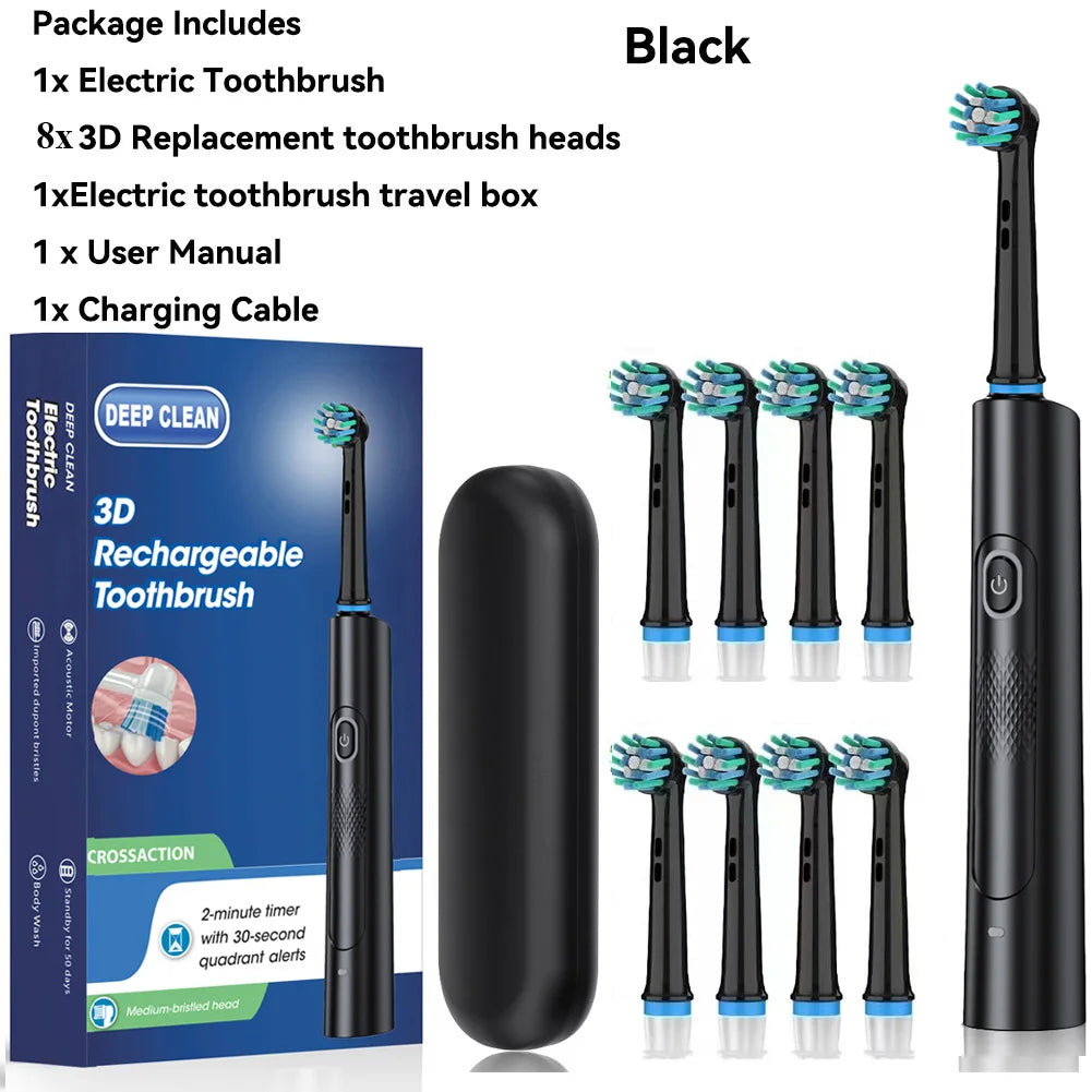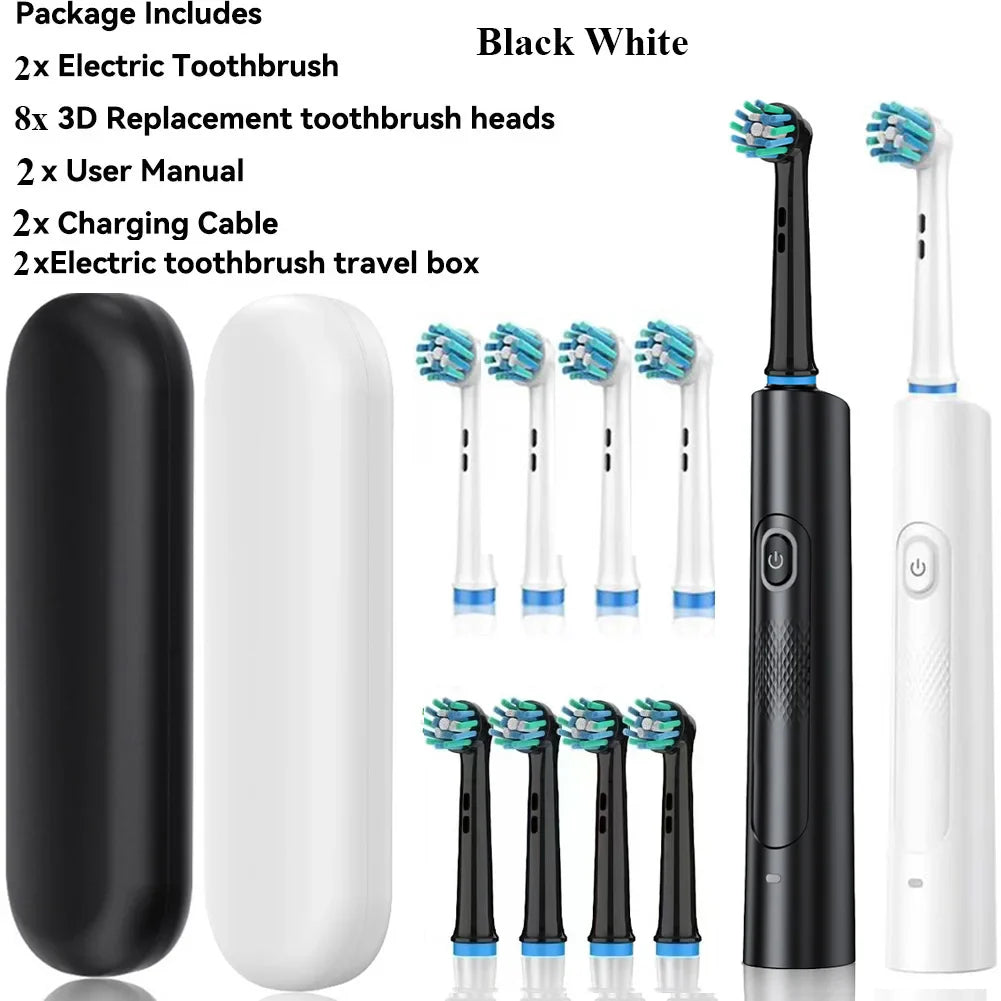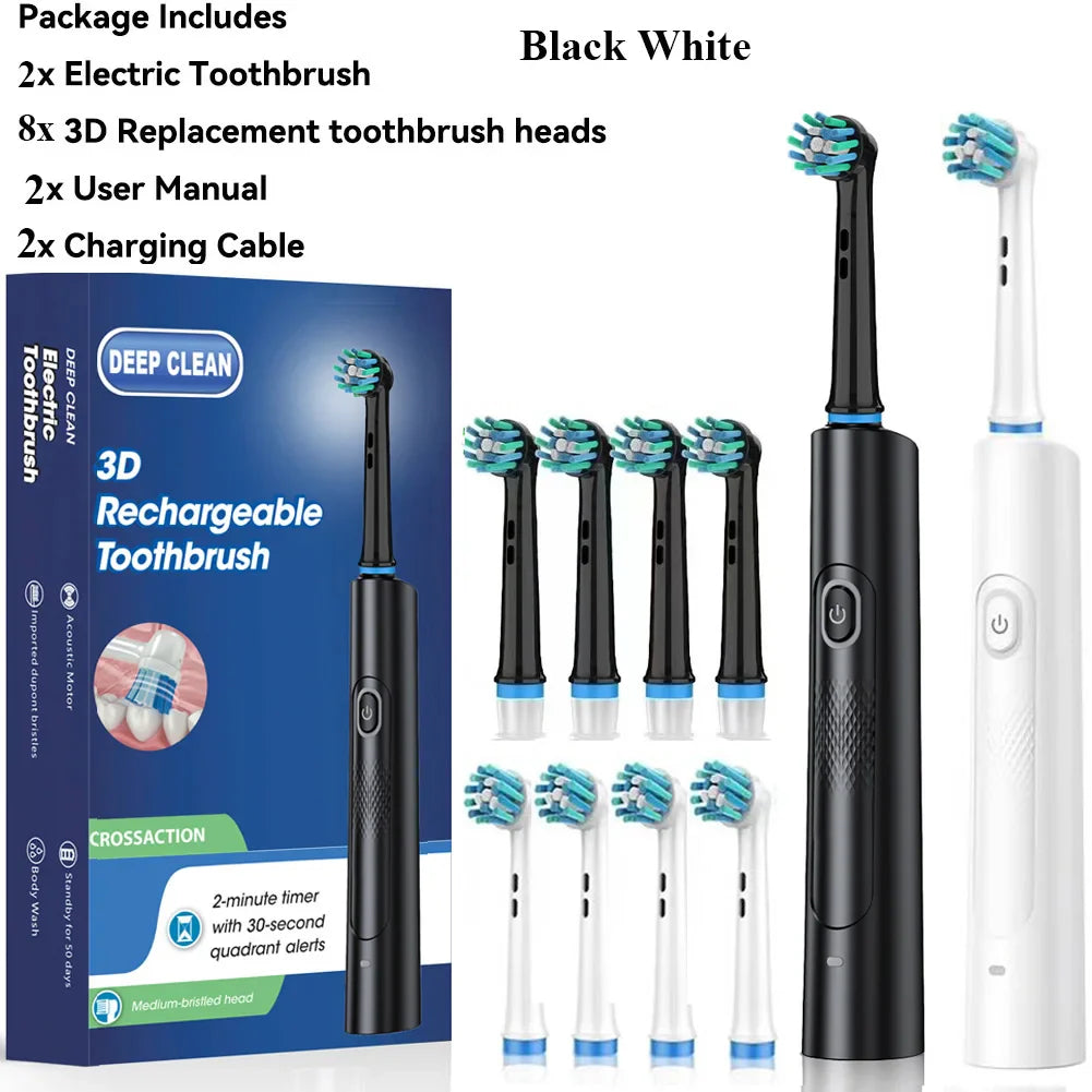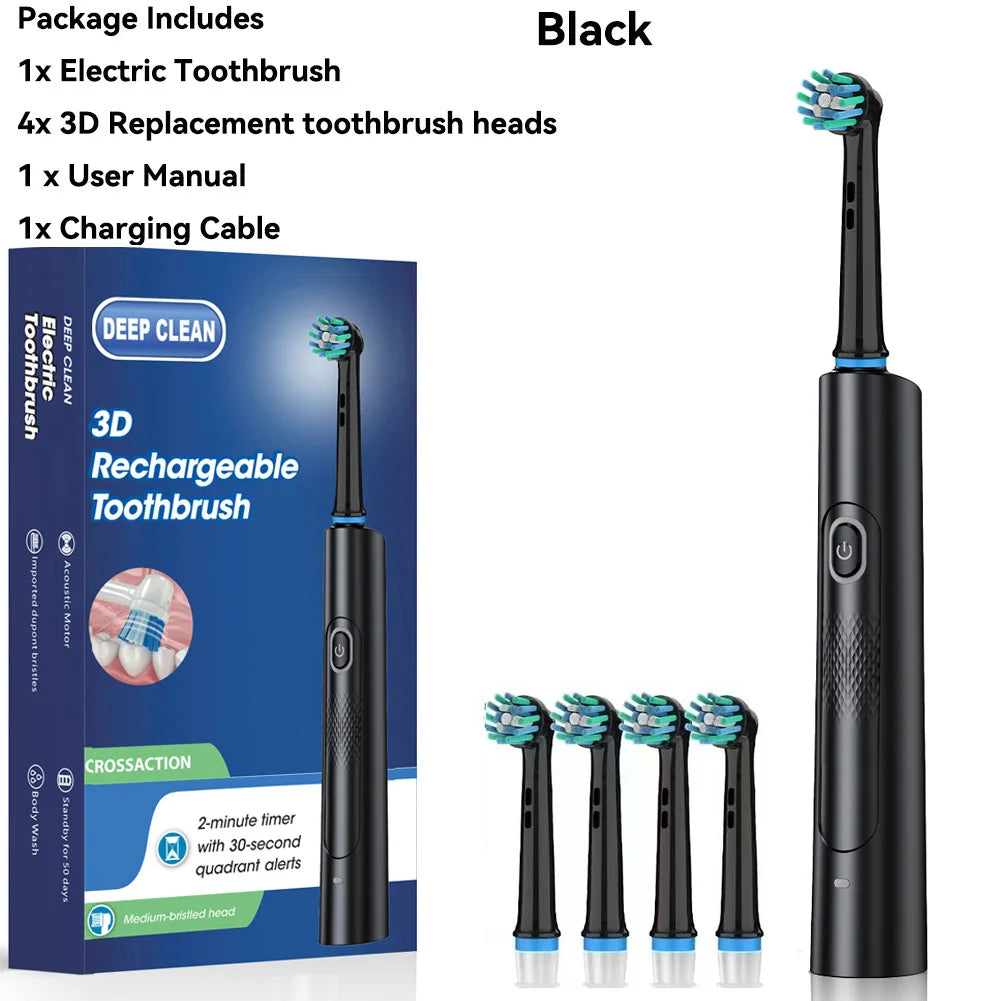 Rotating Electric Toothbrush Black White for Adults with 4 Brush Heads Deep Clean with Rechargeable Power and 2 Min Smart Timer and IP65 Waterproof Technology
